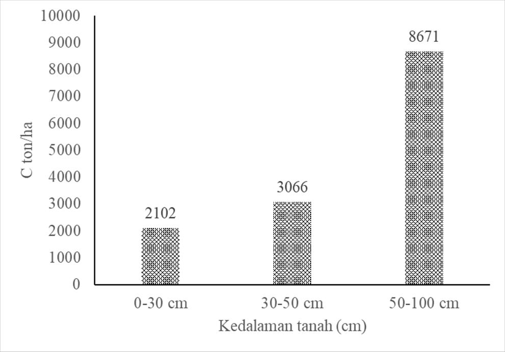 Cadangan karbon sedimen tidak hanya berbeda antar lokasi, tetapi juga berubah seiring kedalaman tanah. Dari hasil pengukuran, terlihat bahwa semakin dalam lapisan sedimen, semakin besar pula karbon yang tersimpan. Pada kedalaman 0–30 cm, cadangan karbon tercatat sebesar 2.102 C ton/ha, meningkat menjadi 3.066 C ton/ha pada kedalaman 30–50 cm, dan mencapai nilai tertinggi, yaitu 8.671 C ton/ha, pada kedalaman 50–100 cm (Gambar 6).